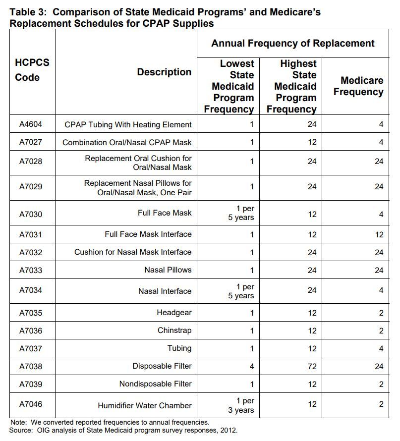 Private insurance typically allows mask and tubing replacement every 6 months, filters every 90 days and machines every 5 years.